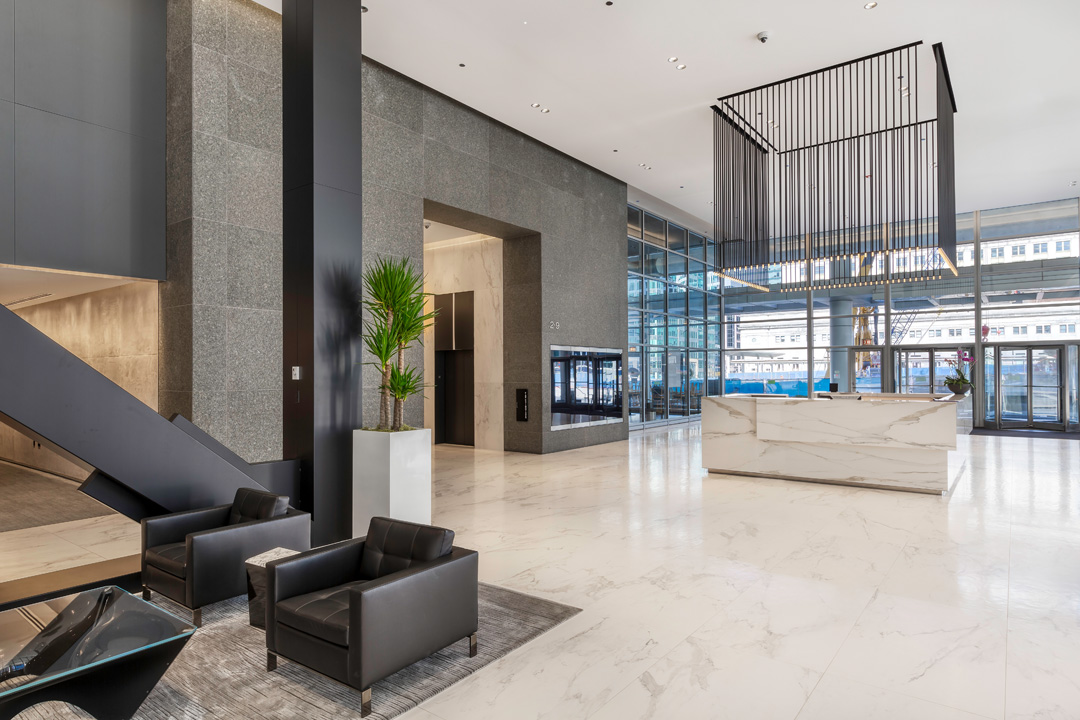 The project located at 525 West Van Buren included a complete renovation of the building lobby, which included the demolition of existing conditions to build-out a new stairway and lounge, as well as relocating the main security desk and installing new flooring and architectural enhancements to the space. Special coordination was required with the architect due to mandated vendors that were located on the East Coast. The space now features a GFRC cladded stair with powder coated metal features throughout, imported marble floor and wall tile.
