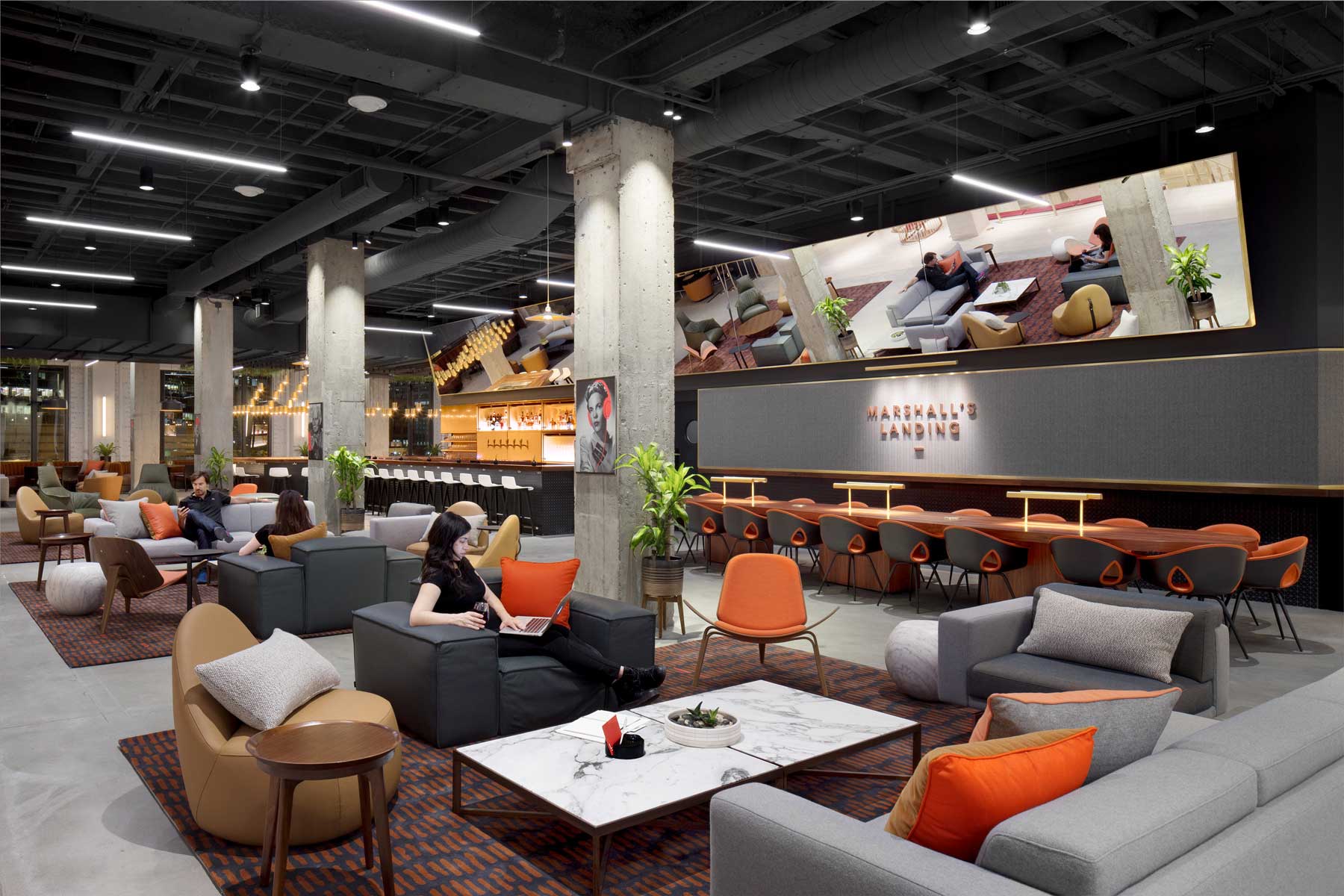 The buildout’s high-end features included a private dining facility with a large door made of walnut and blackened steel, a grand hall lounge with open tables conducive to meetings, and circular bathrooms with porcelain-tiled ceilings.