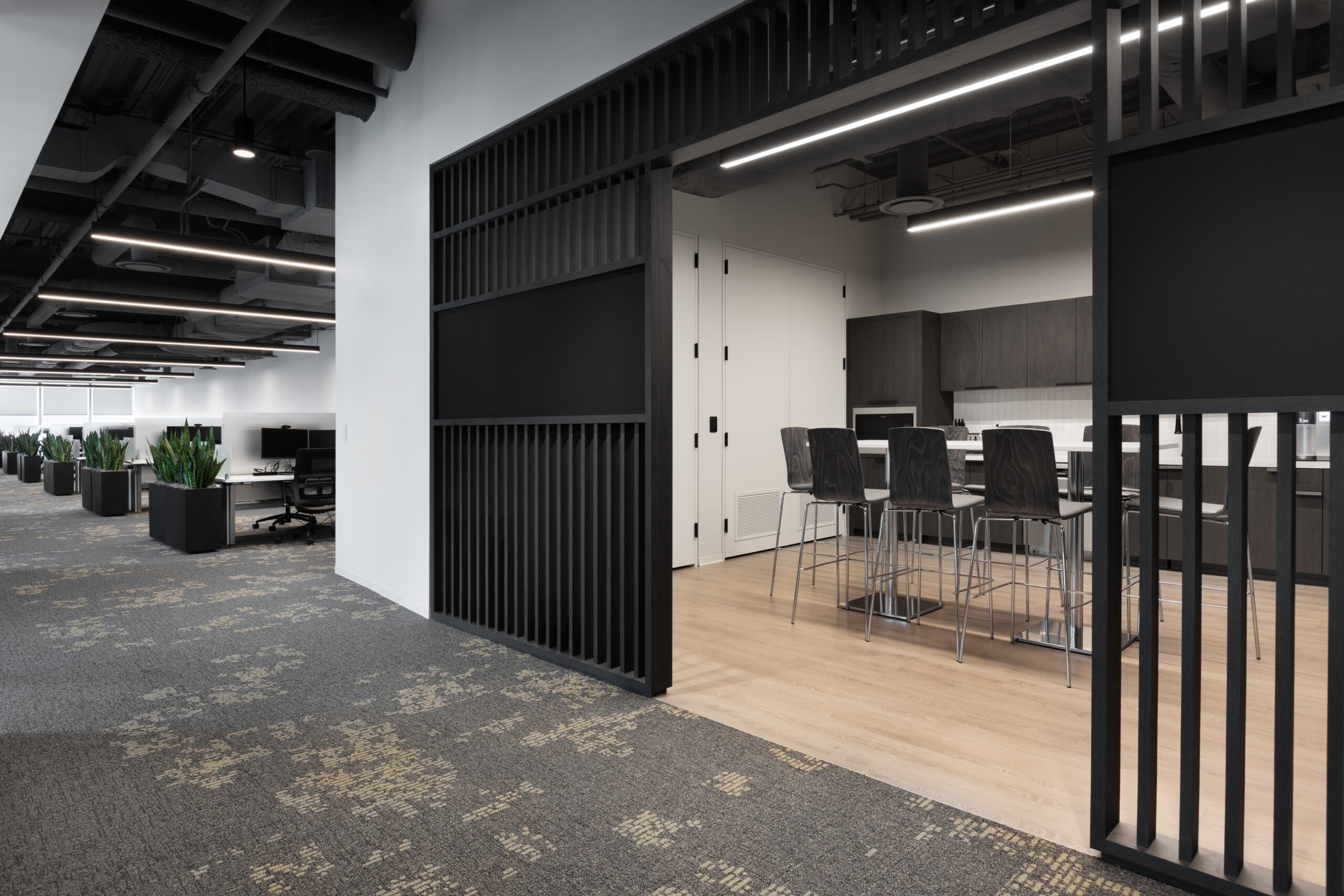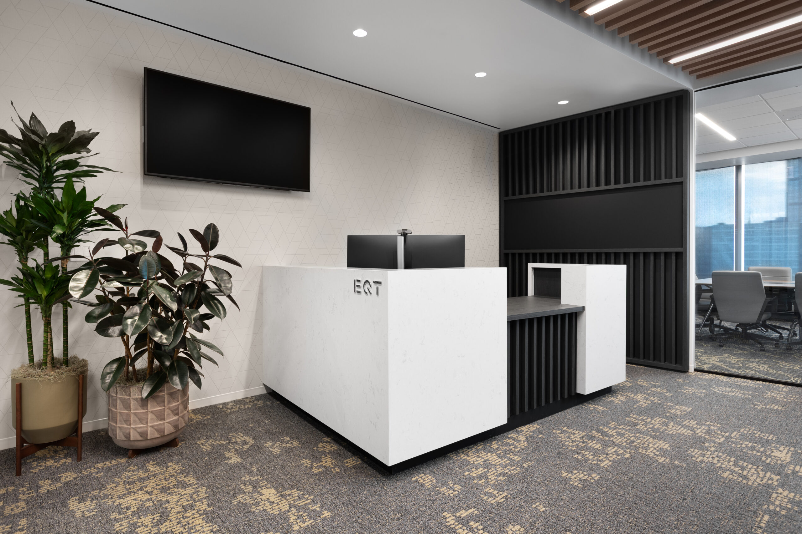 The scope of work included construction of a welcoming new reception area, glass-front private offices, a modern conference room, and a fully built-out breakroom highlighted by a custom millwork entry feature. The design emphasizes transparency, functionality, and a refined professional aesthetic aligned with EQT Exeter’s brand and workplace needs.