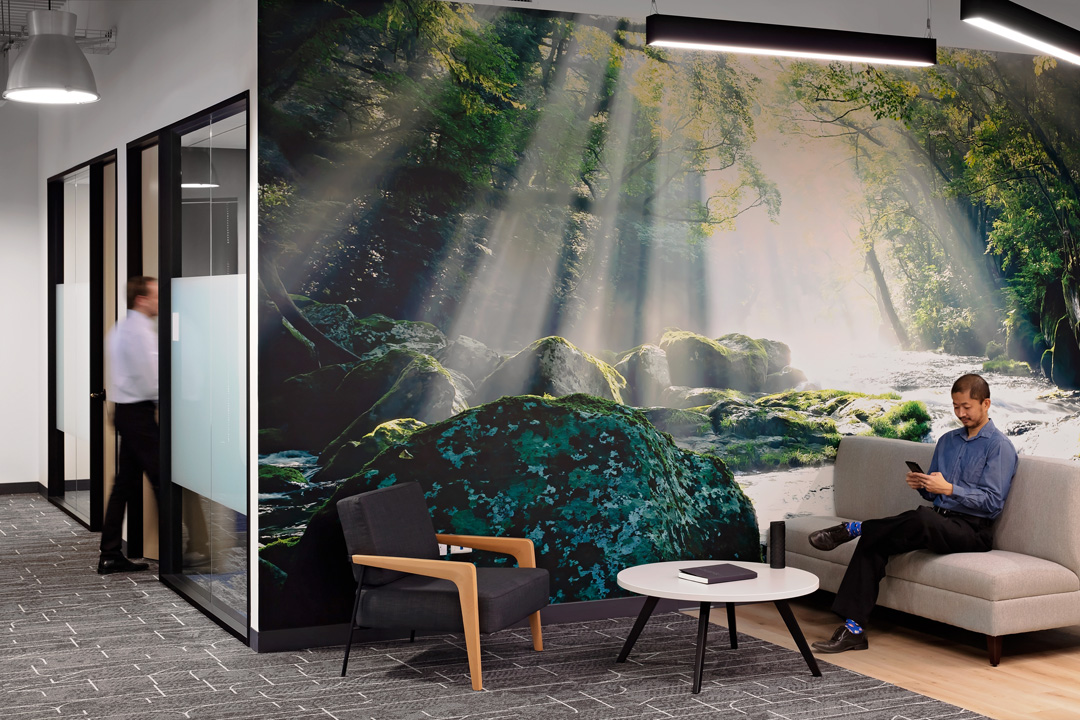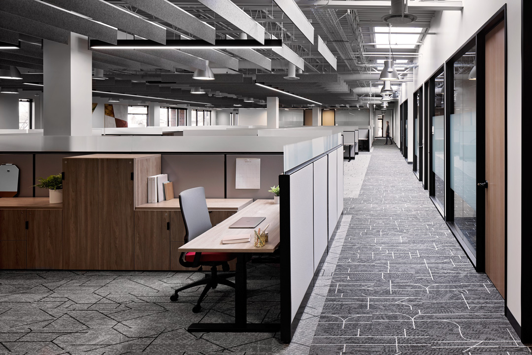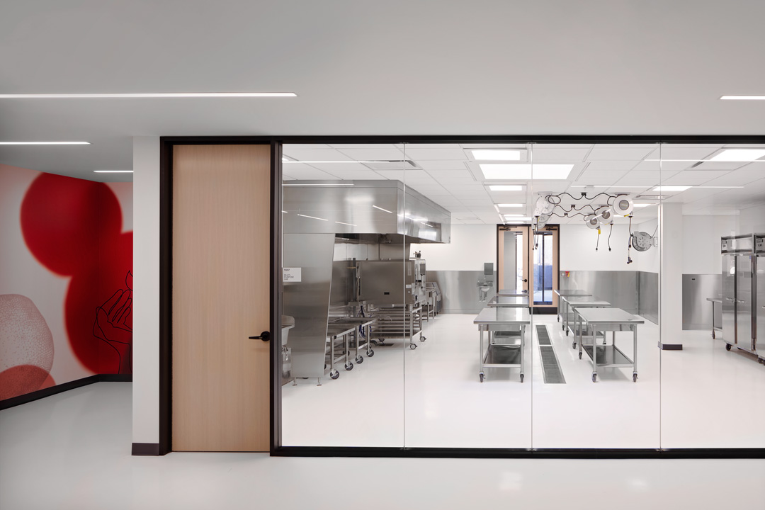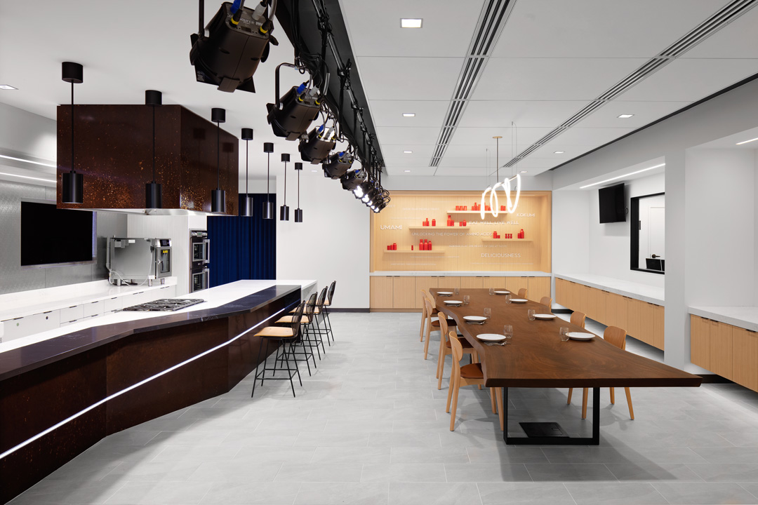 The 55,000 square foot project required the existing space to be completely demolished with the new design meeting the company’s needs. Visitors are now greeted via a new vestibule and entry featuring high-end finishes with a view into the welcome area, customer engagement center and labs. The multiple test labs and kitchens provide sleek, polished spaces for experimentation. Office space includes meeting rooms with acoustic panels and wood trim, and a large auditorium with custom AV. The separate engagement center and corresponding AV room create the perfect environment for intimate cooking events and production to broadcast live streaming. Bold display walls throughout feature environmental graphics that focus on the company’s achievements and history throughout the years.