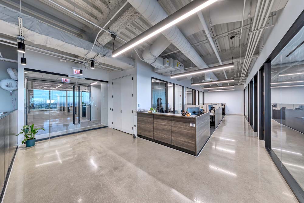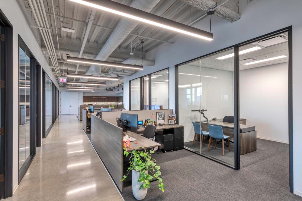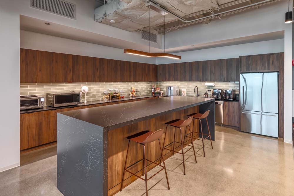 The newly completed space features a welcoming reception area that sets the tone upon arrival, leading into an open office environment that encourages interaction and natural light share across the floor. Glass-front private offices and huddle rooms were incorporated to provide areas for focused work and meetings while maintaining a sense of transparency throughout the space. A fully equipped break room offers Verismo employees a comfortable, inviting setting to recharge and build community.